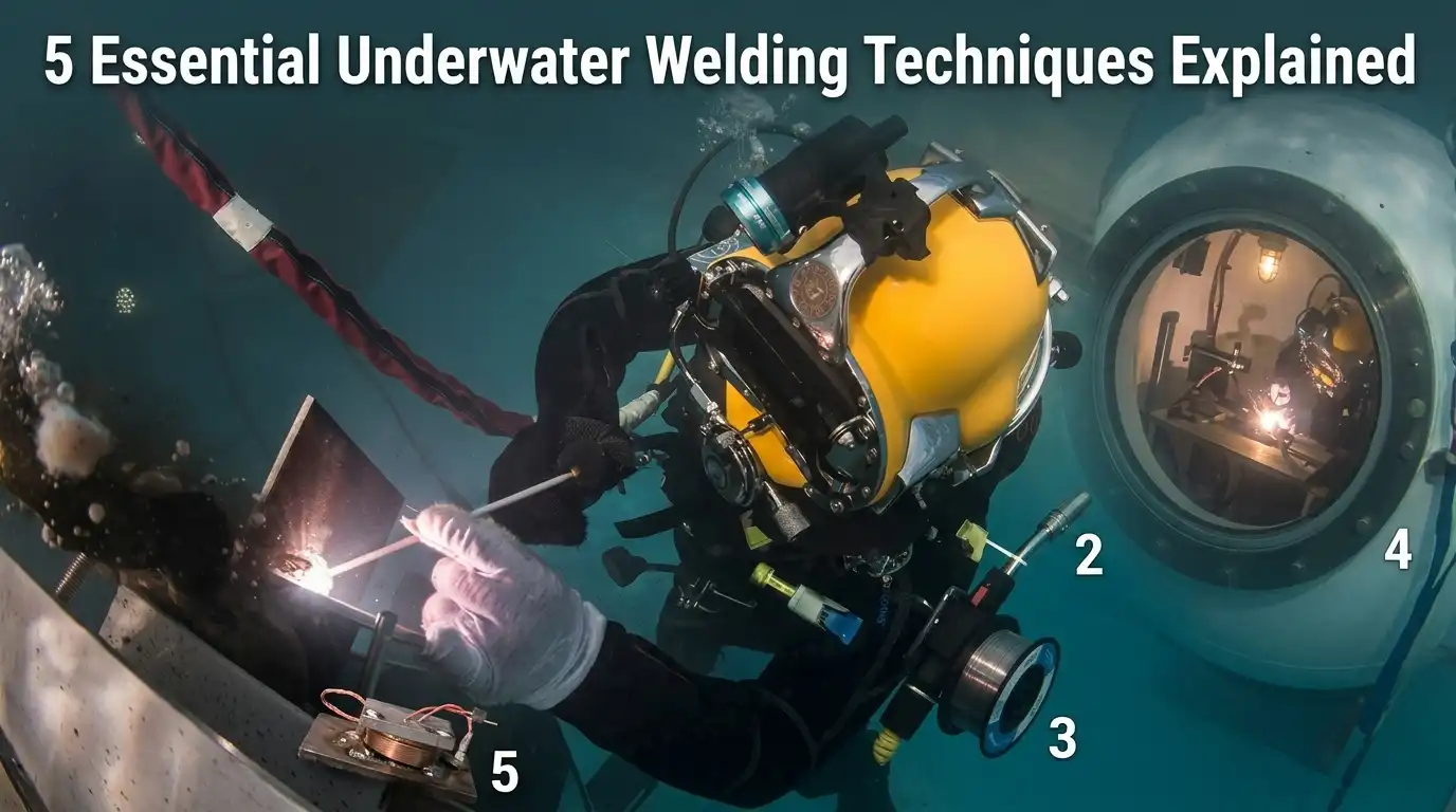 Underwater welding techniques are specialized joining processes that fuse metal components while fully or partially submerged in water, typically used for repairing ship hulls, offshore oil platforms, pipelines, nuclear facilities, and bridge pilings. The five essential methods are: wet shielded metal arc welding (SMAW), hyperbaric (dry) chamber welding, flux-cored arc welding (FCAW), friction and stud welding, and hybrid/robotic systems. Each solves a different combination of depth, weld integrity, and cost constraints.