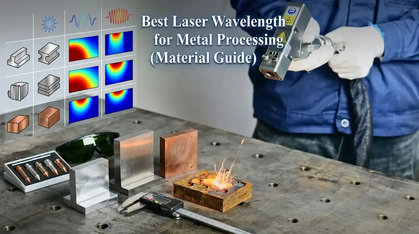Direct answer: For most metal shops, 1070 nm fiber handles cutting, welding, and cleaning on ferrous metals; 515 nm green or 450 nm blue wins for copper welding; 1064 nm nanosecond fiber dominates marking; and pulsed 1064 nm handles laser cleaning. The right laser wavelength for metal processing depends less on the task itself than on the metal-task pair.