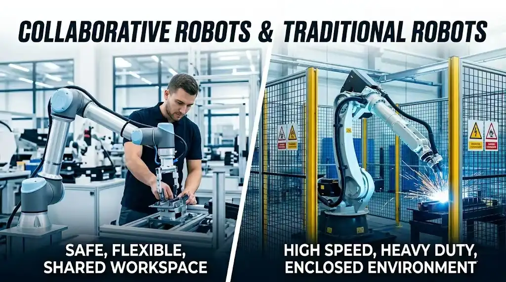 cobot vs robot difference shown side by side — collaborative robot with human worker and fenced industrial robot in factory