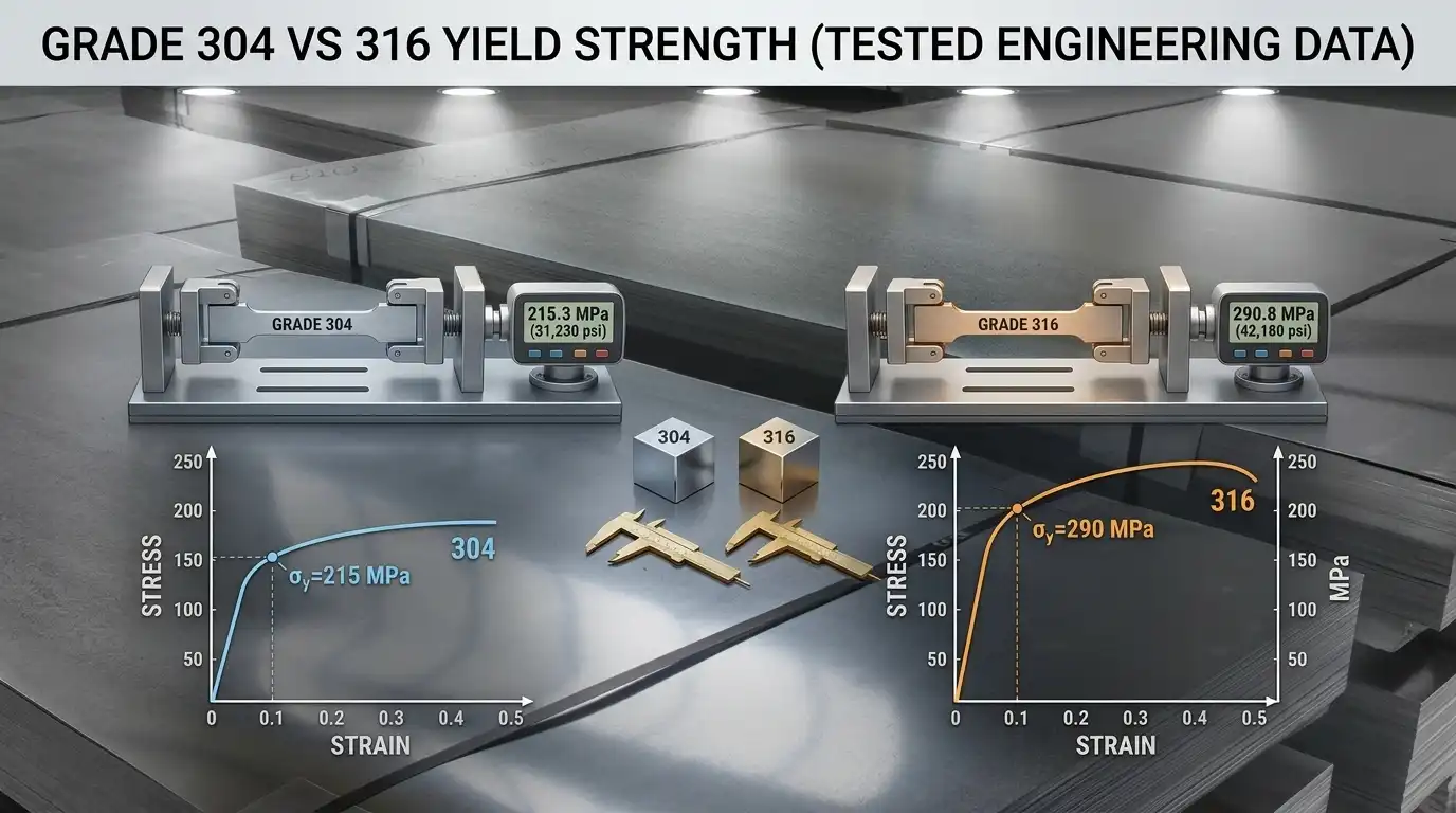 Here’s the short version: the 304 stainless steel yield strength and 316’s baseline both sit at 205 MPa (30 ksi) per ASTM A240. Mechanically, they’re twins at yield. The real separator is corrosion performance.