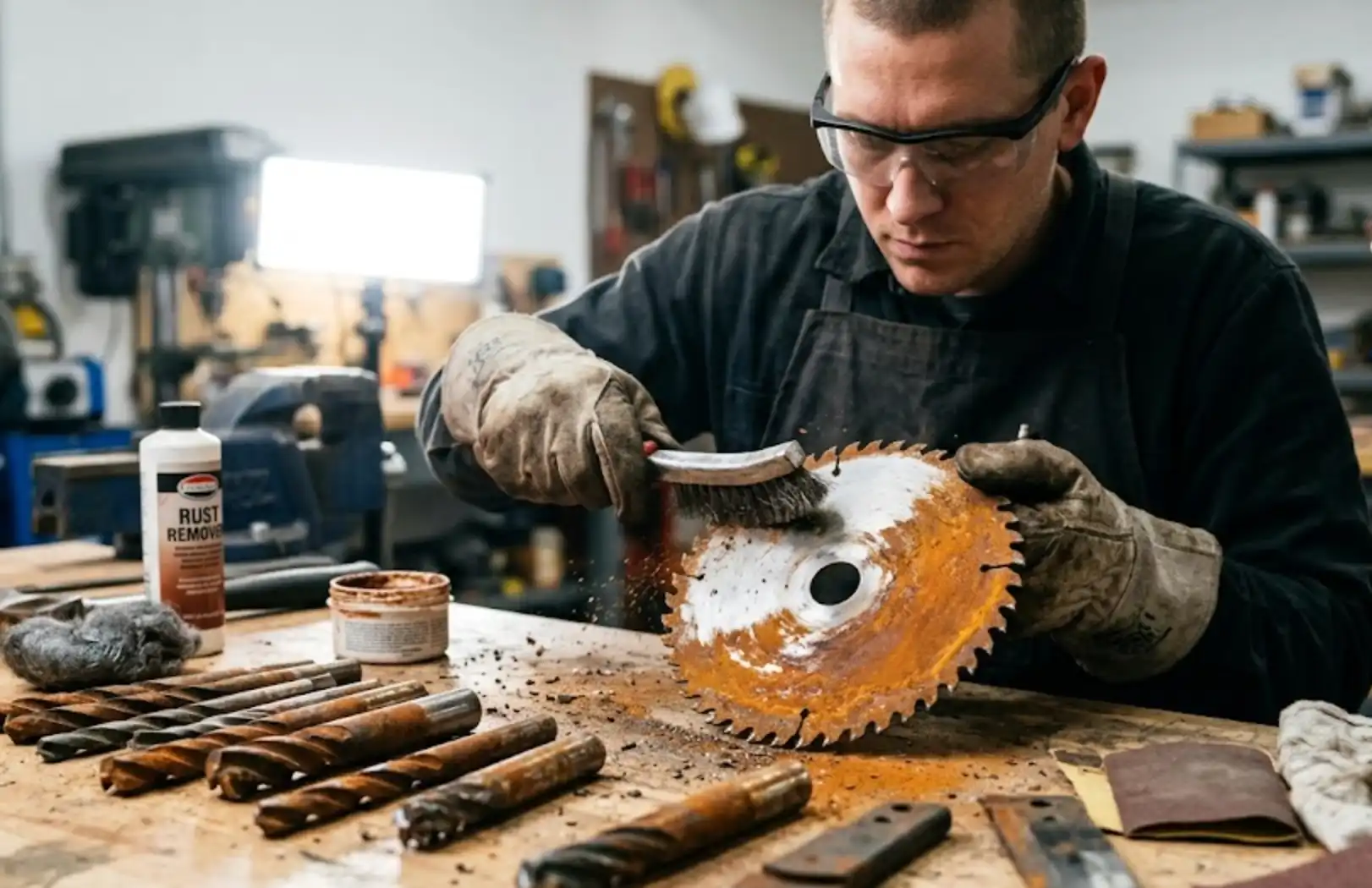 Rusty cutting tools on a workbench with rust removal supplies including vinegar, steel wool, and commercial rust remover