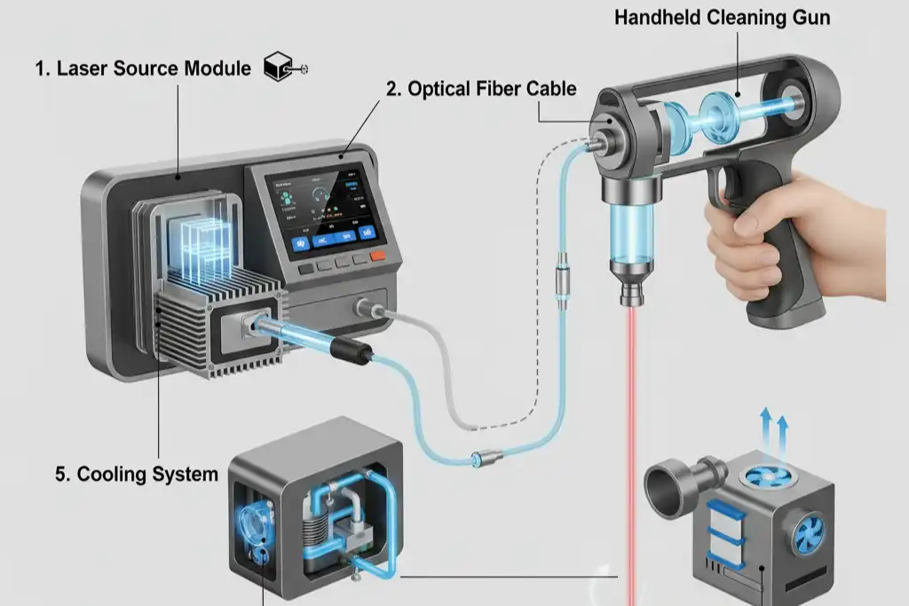 Knowing the main laser cleaning machine components helps you use your equipment well. Each part has a special job to make the laser cleaning system safe and efficient. Let’s see what parts are in a typical laser cleaning machine and how each one helps with cleaning.