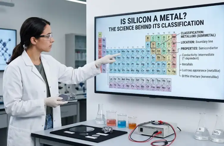 Silicon sits at position 14 on the periodic table, makes up roughly 27.7% of Earth’s crust by mass, and powers nearly every electronic device you own — yet most people can’t say whether it’s a metal or not. So, is silicon a metal? No. Silicon is officially classified as a metalloid, an element that shares properties with both metals and nonmetals but doesn’t fully belong to either category. It conducts electricity better than glass but far worse than copper, it has a metallic sheen but shatters like ceramic, and that strange in-between behavior is exactly what makes it the backbone of semiconductor technology.