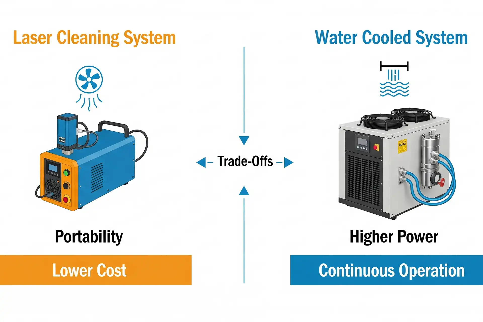 Note: If you need to clean big areas or thick rust, water-cooled systems give you more power and work better for a long time.