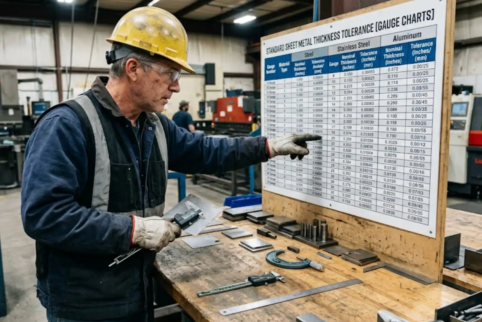 A single sheet of 16-gauge mild steel can legally ship anywhere from 0.0598″ to 0.0641″ thick — a spread of over 7% — and still meet ASTM A568/A568M requirements. That gap is enough to cause fit-up failures, weld burn-through, and rejected assemblies if you haven’t accounted for it. Sheet metal thickness tolerance defines the permissible deviation from a nominal gauge or decimal thickness, and understanding the exact numbers for your material — carbon steel, stainless, or aluminum — is the difference between parts that stack up correctly and costly rework on the shop floor.