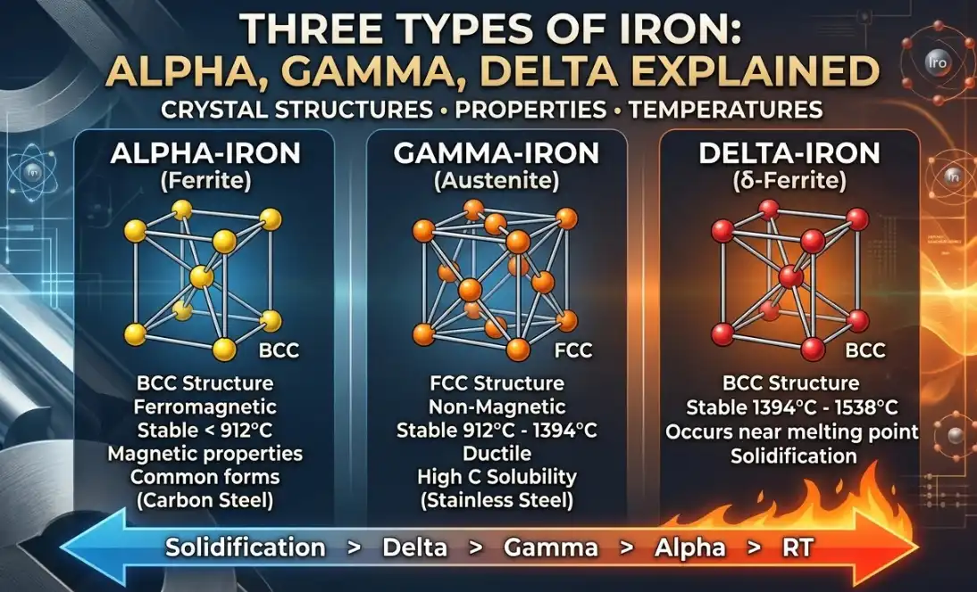 When engineers say the three types of iron, they mean the three allotropic forms of pure iron at ambient pressure: alpha-iron (α-Fe, ferrite), which has a body-centered cubic (BCC) crystal structure and is stable from room temperature up to about 912 °C; gamma-iron (γ-Fe, austenite), which is face-centered cubic (FCC) and stable from roughly 912 °C to about 1394 °C; and delta-iron (δ-Fe), a high-temperature BCC phase stable from approximately 1394 °C to the melting point near 1538 °C. A concise, authoritative summary of these phases—their names, crystal structures, and temperature intervals—appears in Encyclopaedia Britannica’s overview of iron, which describes iron’s allotropy in standard physical metallurgy terms: Britannica’s article on iron.