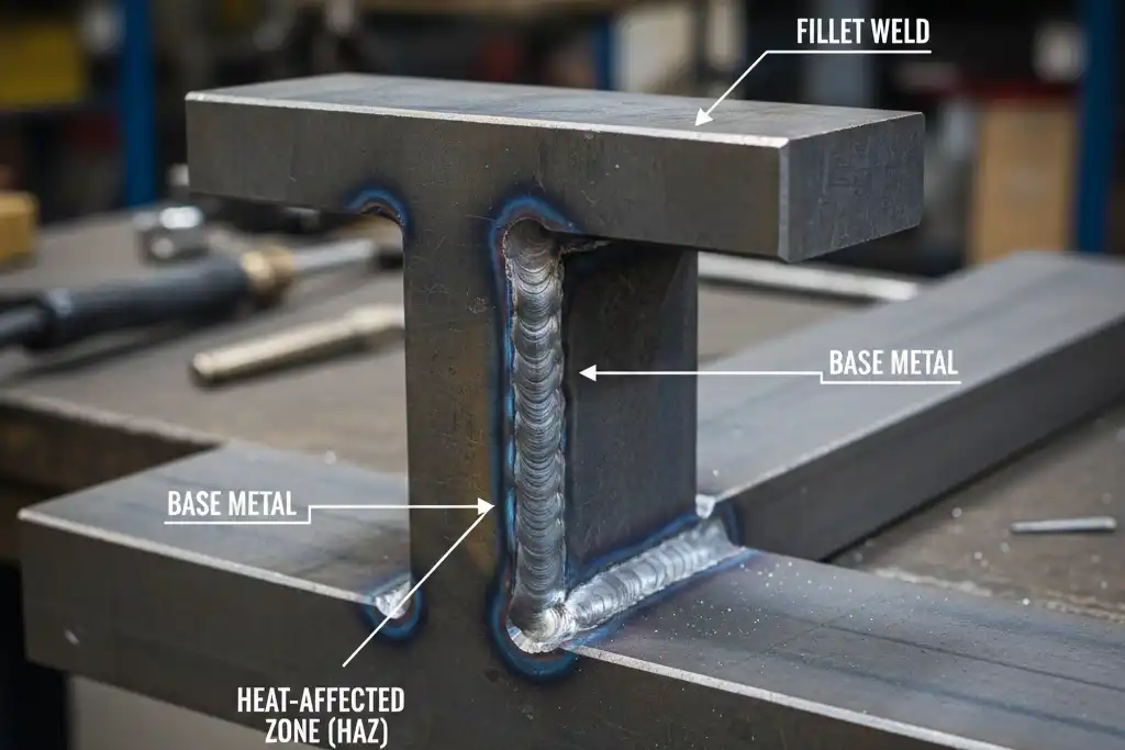 You see two metal pieces joined at a right angle. One stands upright on a flat base. The weld fills the corner, making a clear “T” shape.